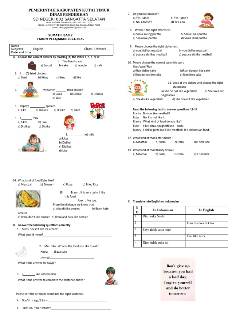 Soal Pilihan Ganda: Soal jenis ini menguji pemahaman kosakata dan makna kalimat sederhana. Siswa memilih satu jawaban yang paling tepat dari beberapa pilihan yang tersedia.